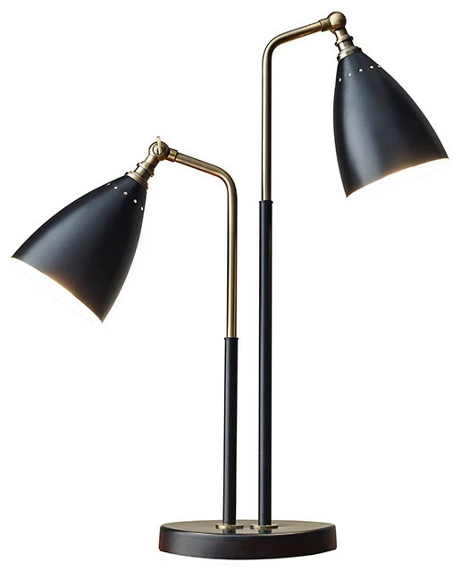 The two-light Chelsea table lamp captures the mid-century spirit with the adjustable, vented matte black metal cone shades in asymmetric heights. Each antique brass angled arm is fitted into a black pole that forms the body. The shades are adjustable up and down with a keyed sprocket.