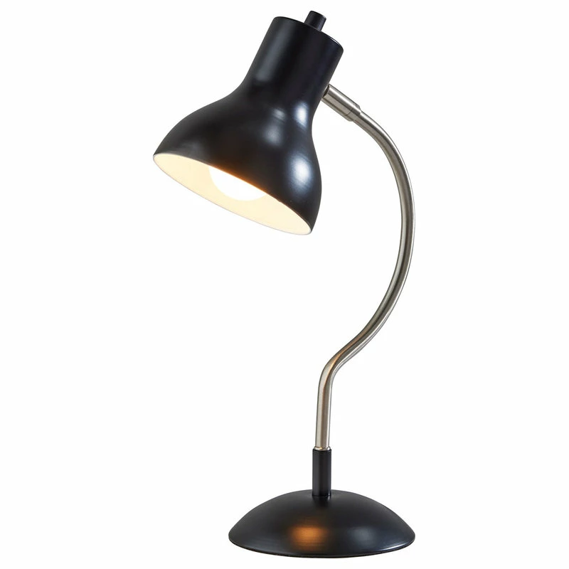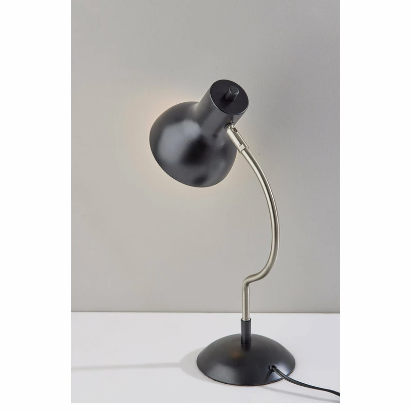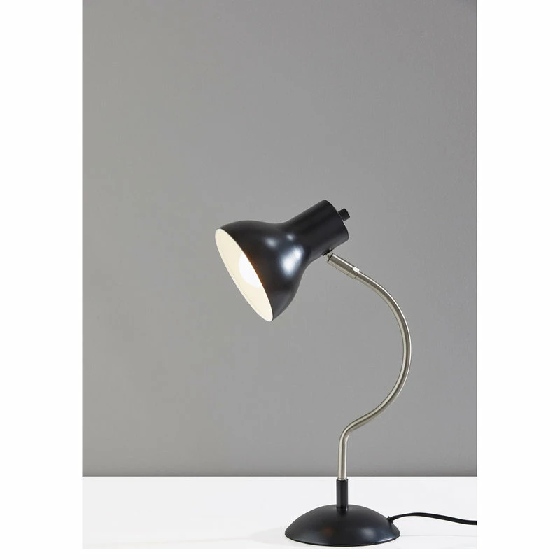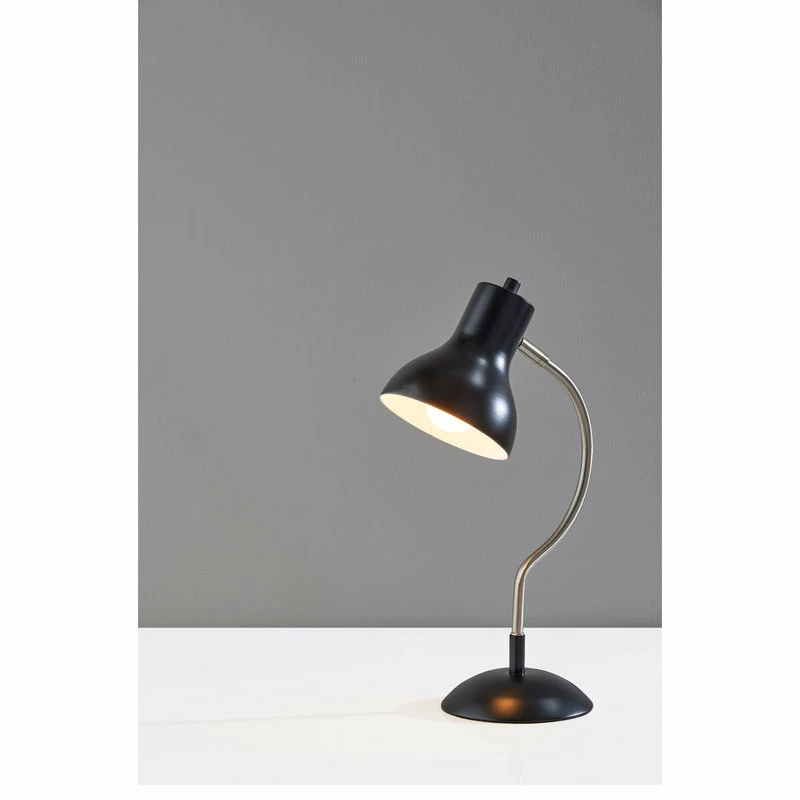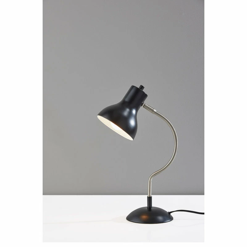 The mid-century modern Elmhurt desk lamp by Simplee Adesso is a study of coordinating curves and style lines in black and brushed steel finish. The dome-shaped metal base in black finish is the perfect complement to the bell-shaped black shade. Connecting the two is a slender, arcing brushed steel stem that brings a distinctive silhouette to the piece. For directional lighting options, the 17″ tall desk lamp offers an articulation point at the base of the shade, allowing you to direct the light wherever it’s needed. Operated by a rotary switch located on the shade to easily turn it on or off, the lamp powers a 40W bulb (not included) and features a 5′ black cord. The Elmhurst desk lamp is also available with an all-over antique brass finish for a more vintage feel.