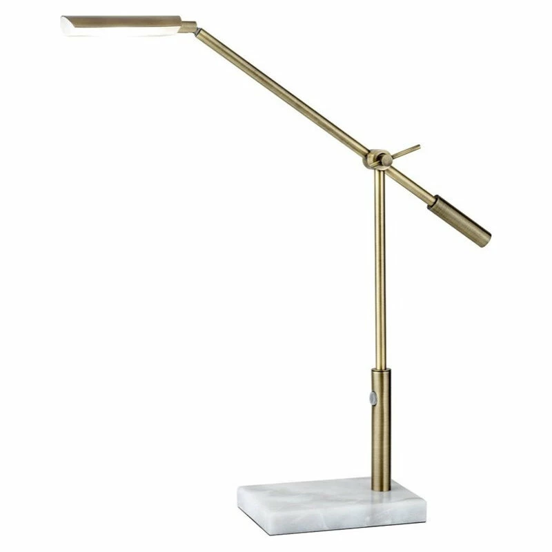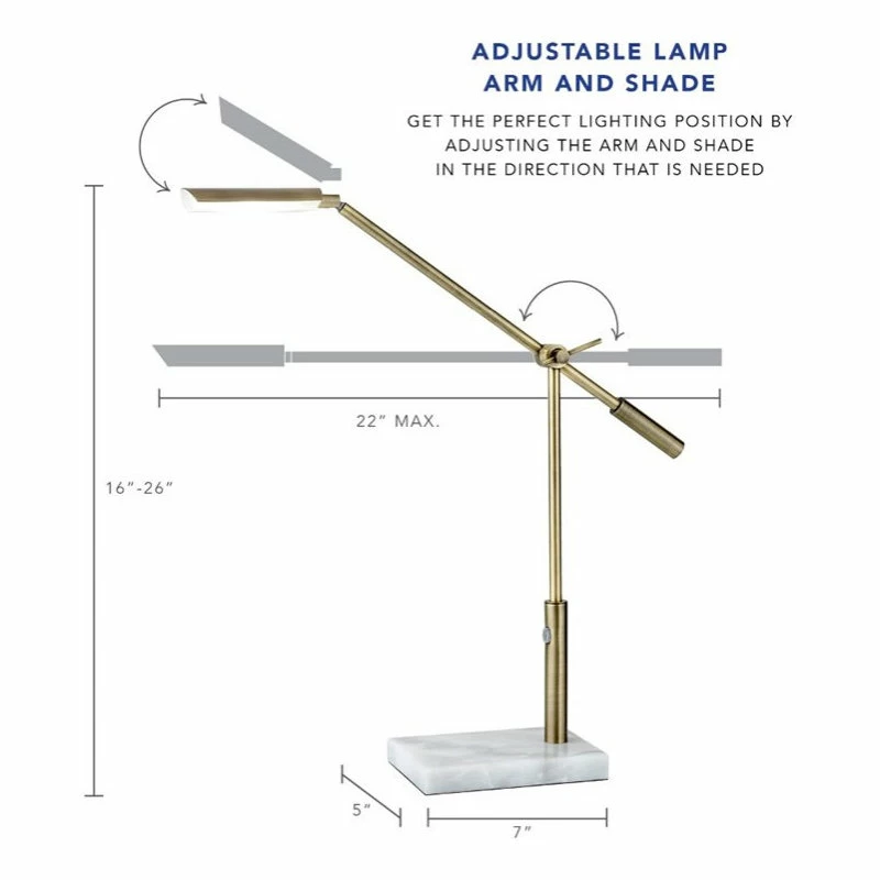 Comprised of antique brass and white marble, the Vera LED Desk Lamp reveals a striking mix of industrial and elegant designs. 500 lumens of strong, energy efficient LED task lighting can be dimmed using a touch dimmer switch and also directed where it is needed with an adjustable shade and arm. This full spectrum LED light emulates natural daylight to ease the strain on your eyes. This lamp has a black cord and is not smart outlet compatible. The LED lights are integrated into the lamp and are not replaceable, but last 50,000 hours.