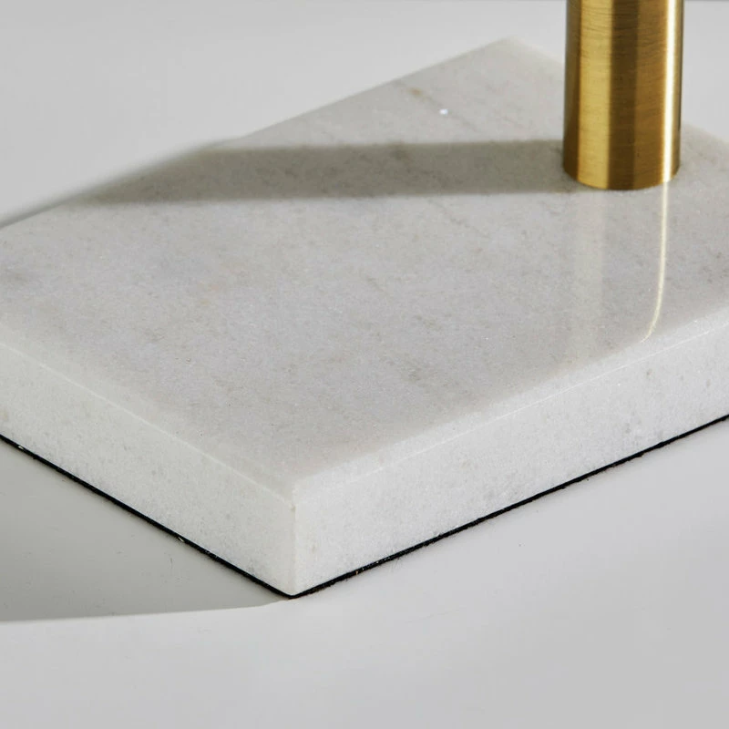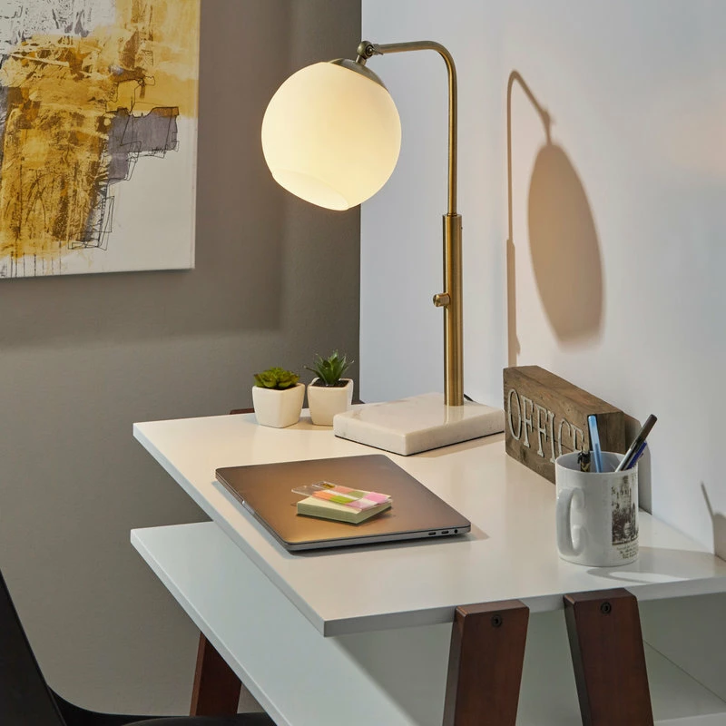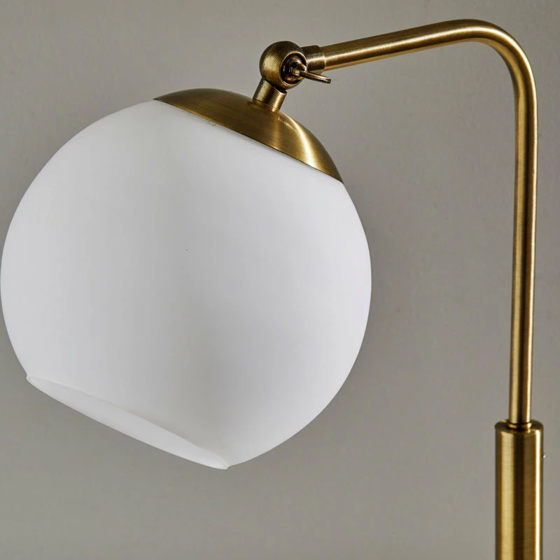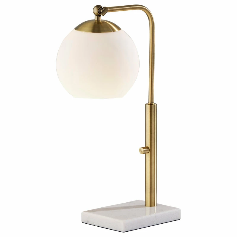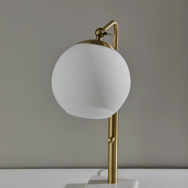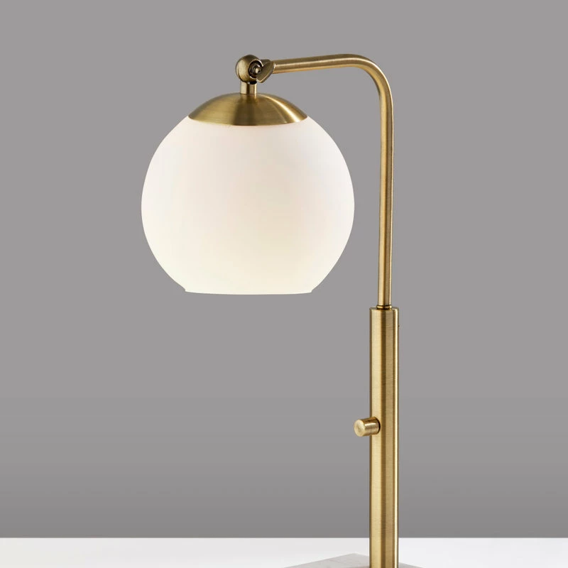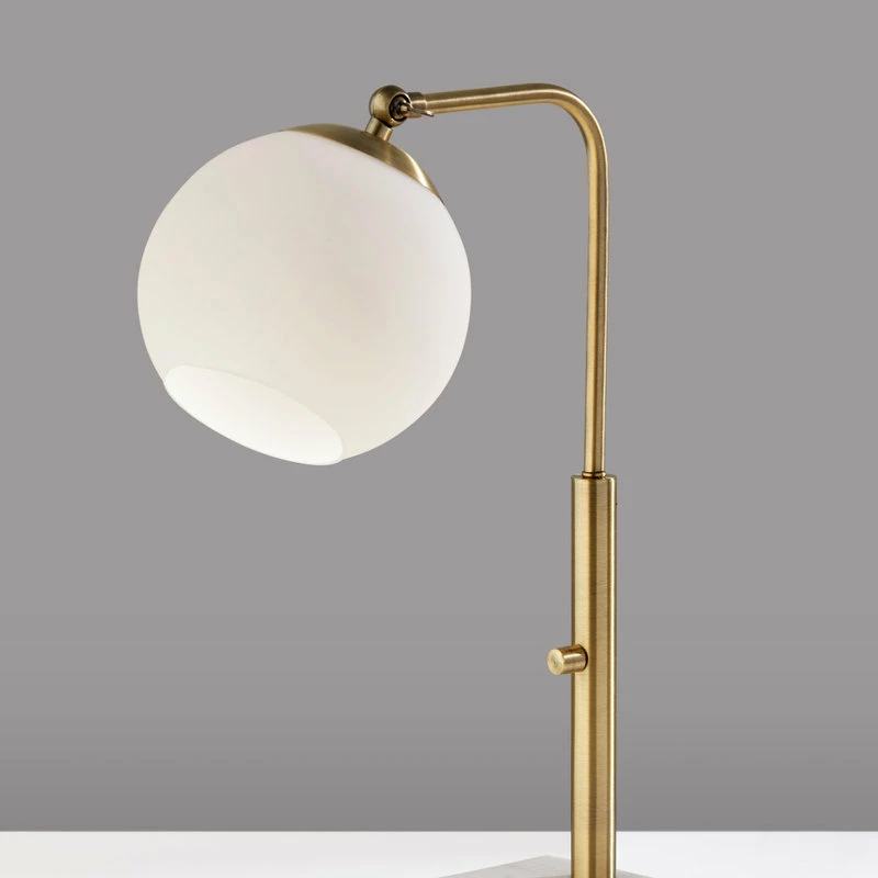 Inspired by mid-century design, the Remi table lamp will update your style with a hint of classic elegance. Mixed materials create a high end decorative look that is both functional and stylish. An warm antique brass metal finish is paired with a white mable base and a white opal glass globe shade. Use the deocrative joint to adjust the shade to its desired position. A conveniently located on/off rotary switch is located on the pole.