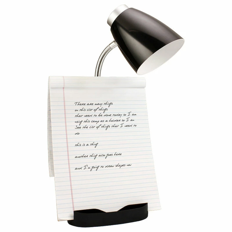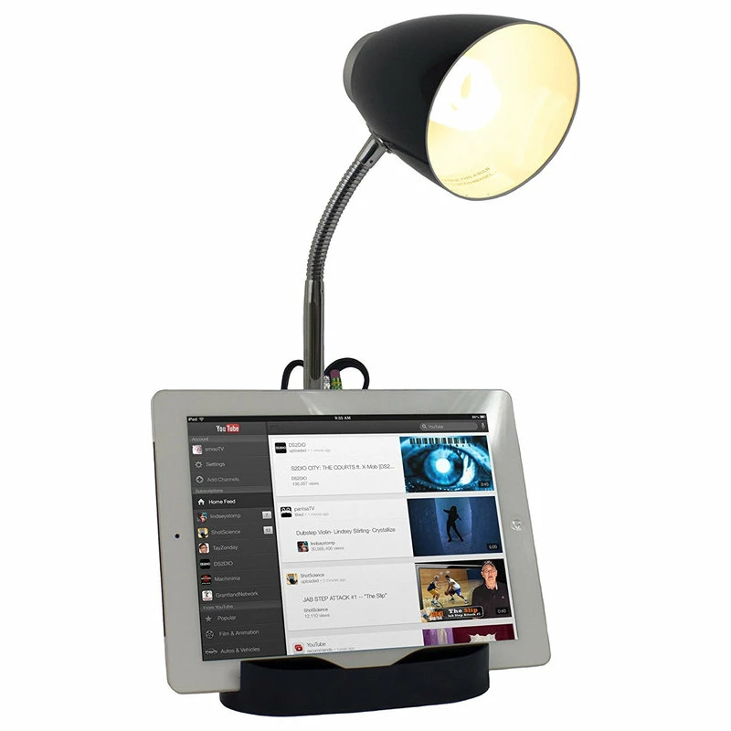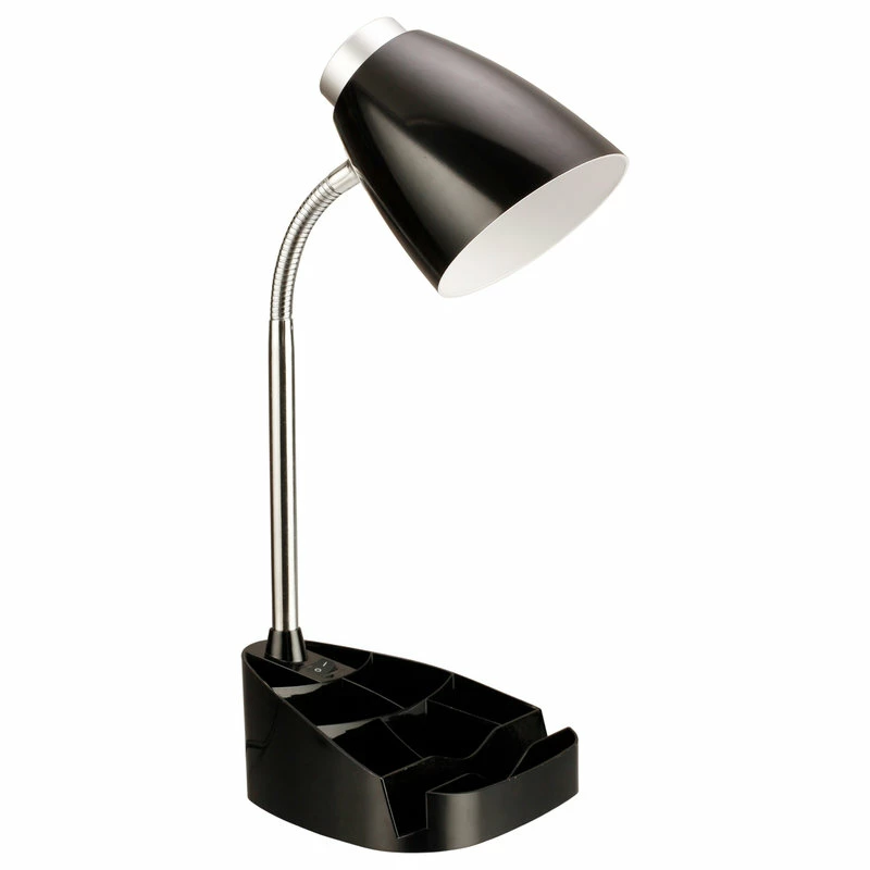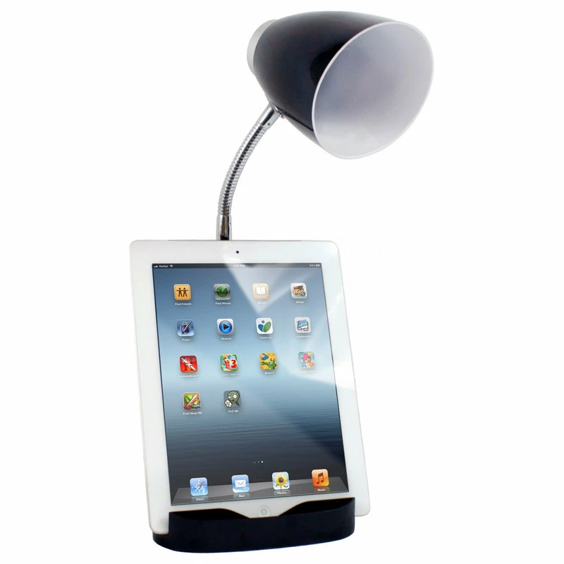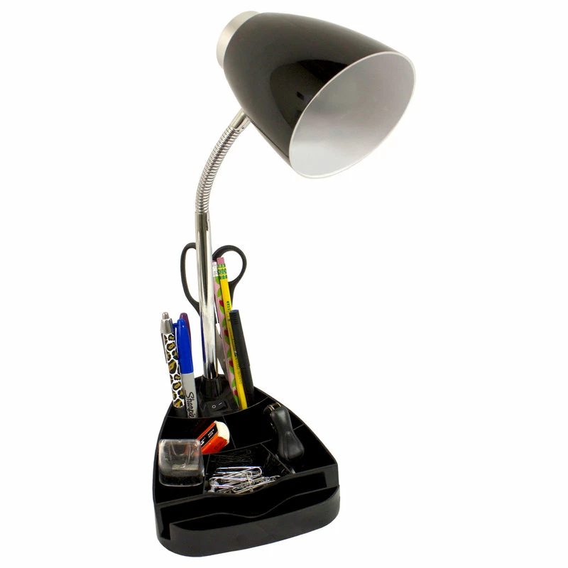 Style and functionality meet with this fun organizer desk lamp with iPad stand. It is beautifully finished and comes equipped to hold many of the important essentials needed in a desk organizer. The flexible chrome gooseneck allows you to point the light exactly where you need it. ON/OFF flip switch is located on the base for convenience. Organizer includes 8 compartments for storing pens, pencils, paper clips, etc. It also has a spot to rest your iPad, book, or notebook for easy viewing. Perfect for office, kids room, or college dorm!