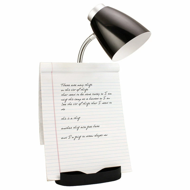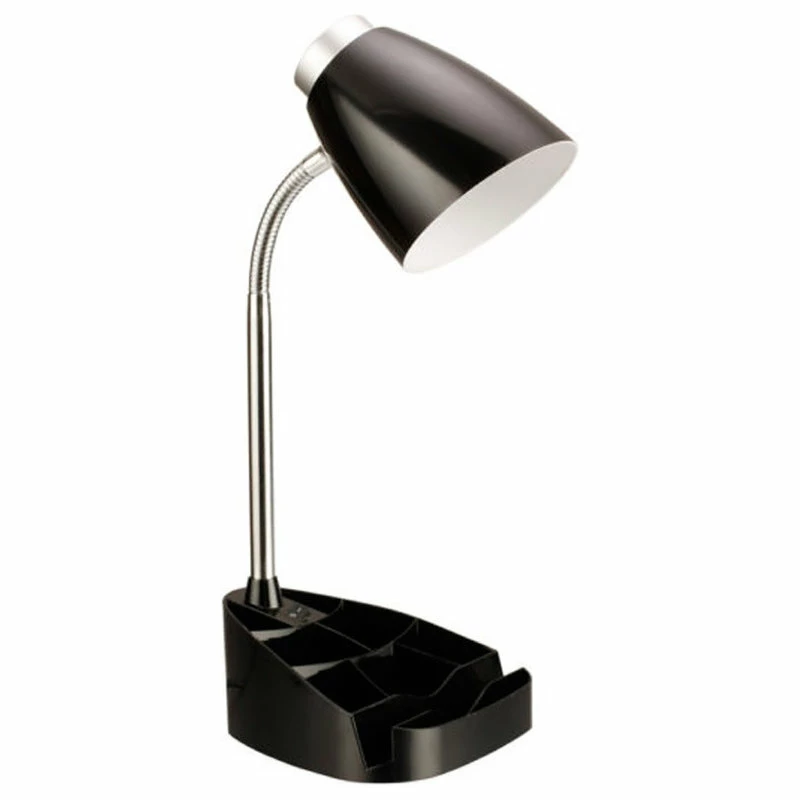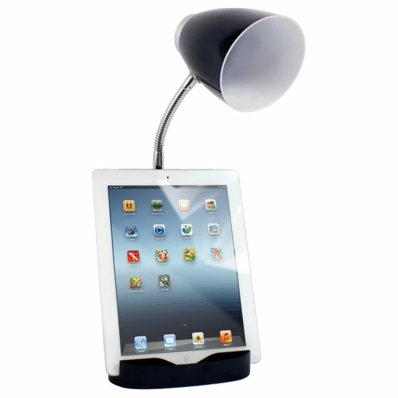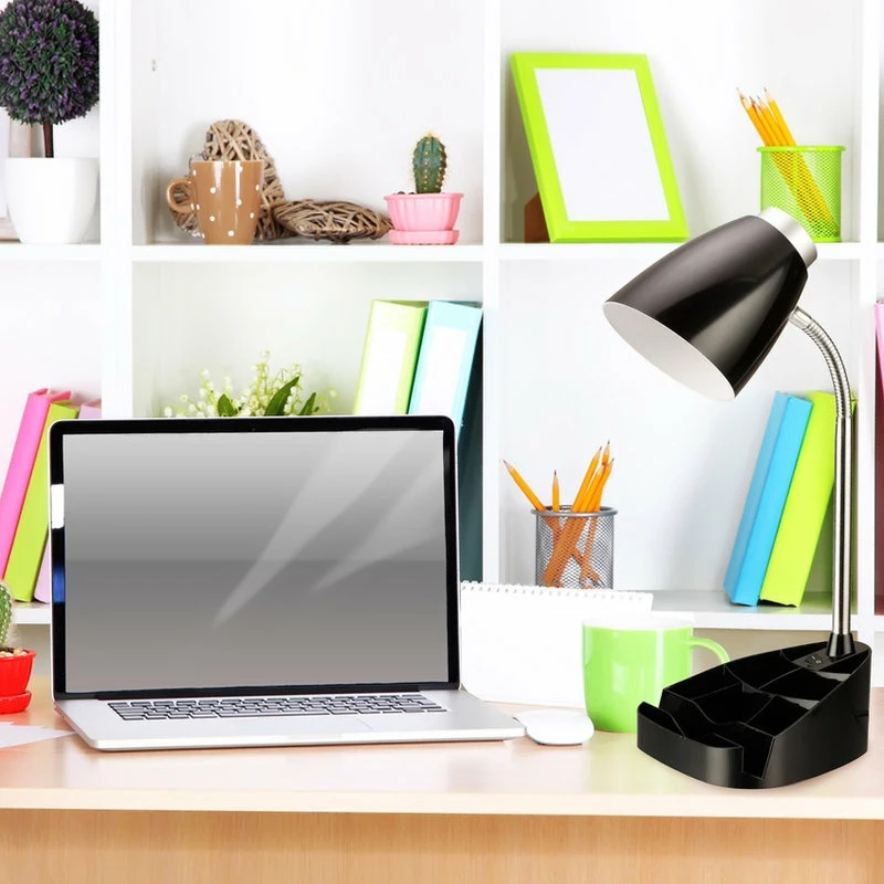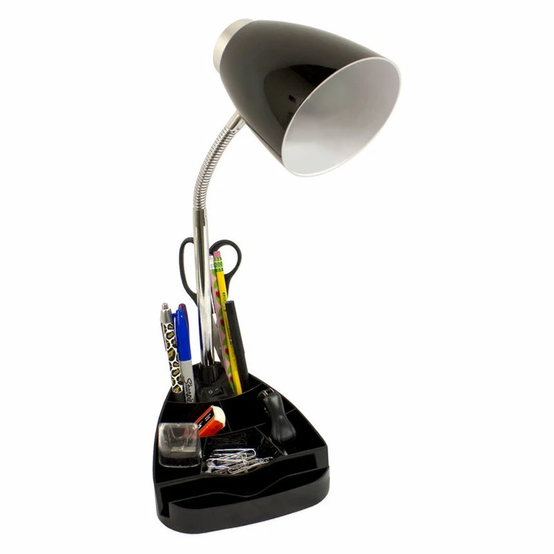 Style and functionality meet with this fun organizer desk lamp with iPad stand. It is beautifully finished and comes equipped to hold many of the important essentials needed in a desk organizer. The flexible chrome gooseneck allows you to point the light exactly where you need it. ON/OFF flip switch is located on the base for convenience. Organizer includes 8 compartments for storing pens, pencils, paper clips, etc. It also has a spot to rest your iPad, book, or notebook for easy viewing. Perfect for office, kids room, or college dorm. Material breakdown ABS plastic: 51.5%, Iron: 42.6%, Switch/plug: 5.9%. Bulb type Incandescent Uses 1 light x 15 wattage type A15 medium base bulb (not included) 13 wattage CFL mini twist bulb is highly recommended as it gives off the light of a regular 60 wattage incandescent bulb.