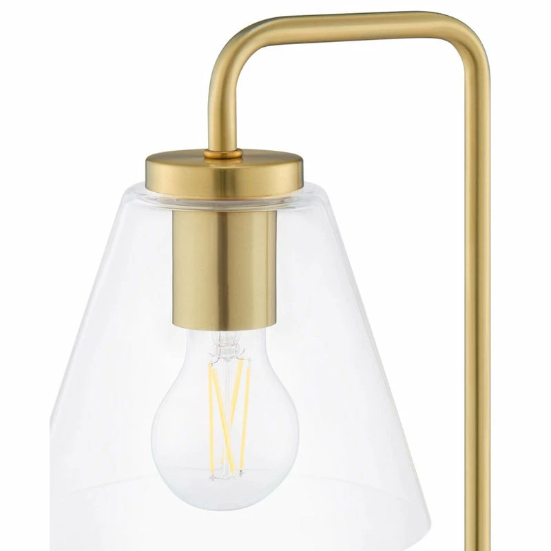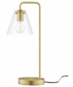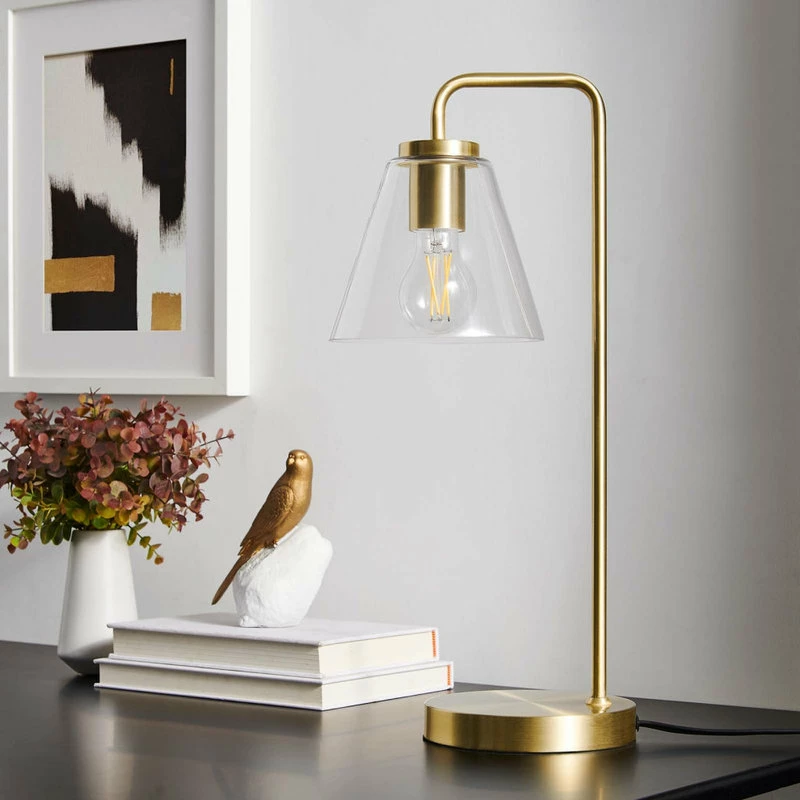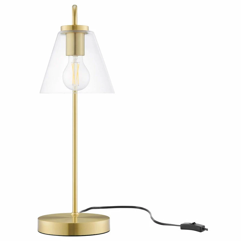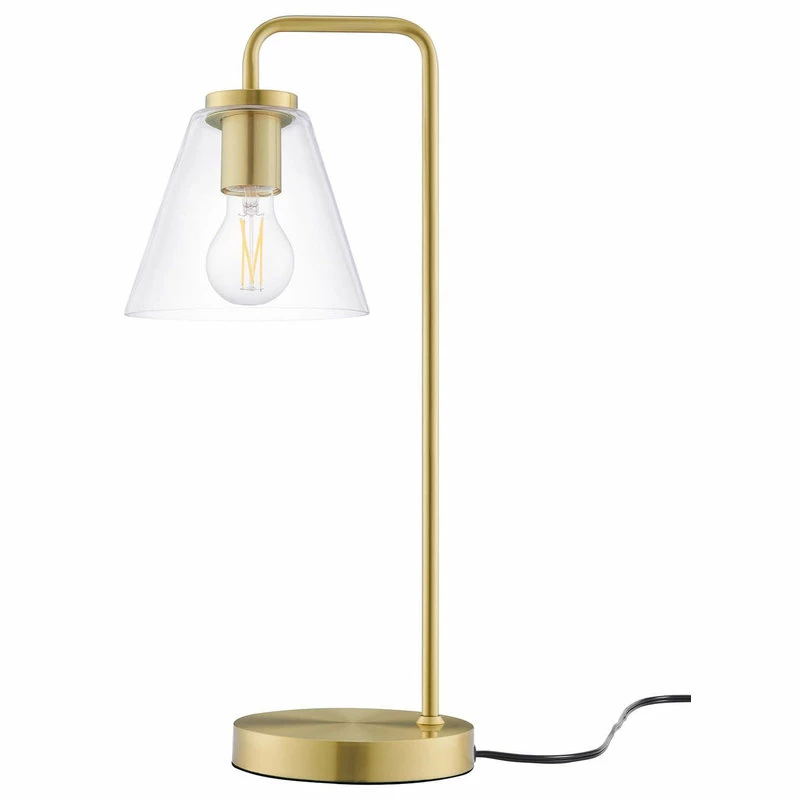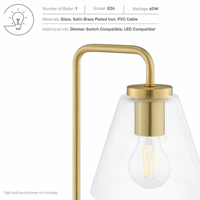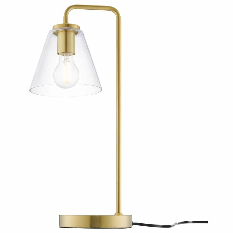 The Element Glass Table Lamp accentuates your home decor in the living room, bedroom, office, or study room with its distinctive mid-century modern aesthetic. This side table lamp brings farmhouse appeal to mid-century modern, contemporary, rustic, or eclectic decors, boasting a classic transparent glass cone shade. An ideal desk lamp for the home office, Element is solidly constructed with a bent-pipe arm and a round iron base. This dimmable coffee table lamp is equipped with a black power cord and a convenient on/off switch. Requires 1 E26 60W max bulb or LED equivalent (not included). Compatible with dimmer switches (not included). Assembly required. Clean with a soft, damp cloth.