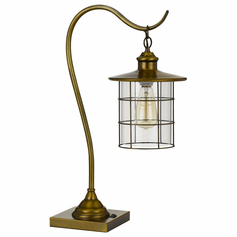25 Inch Metal Downbridge Design Desk Lamp with Caged Shade, Antique BrassPlace this sturdily constructed metal Desk lamp in your home office space or study room to adorn its beauty and also make the best use of it. Replicating downbridge design, it has curved neck with cage design shade which compliments its construction. This piece comes with the Edison bulb of 60W which allows it to illuminate the entire surrounding and create the perfect atmosphere for a small house gathering.