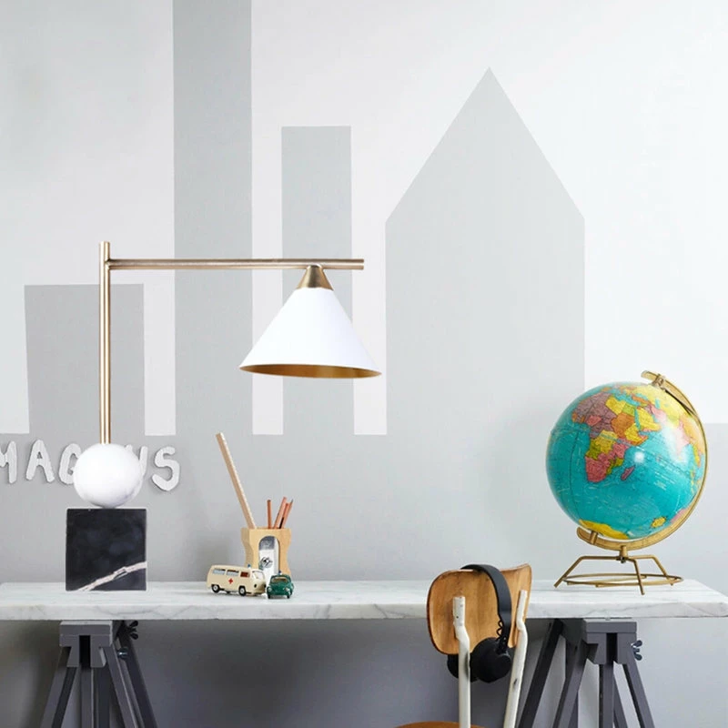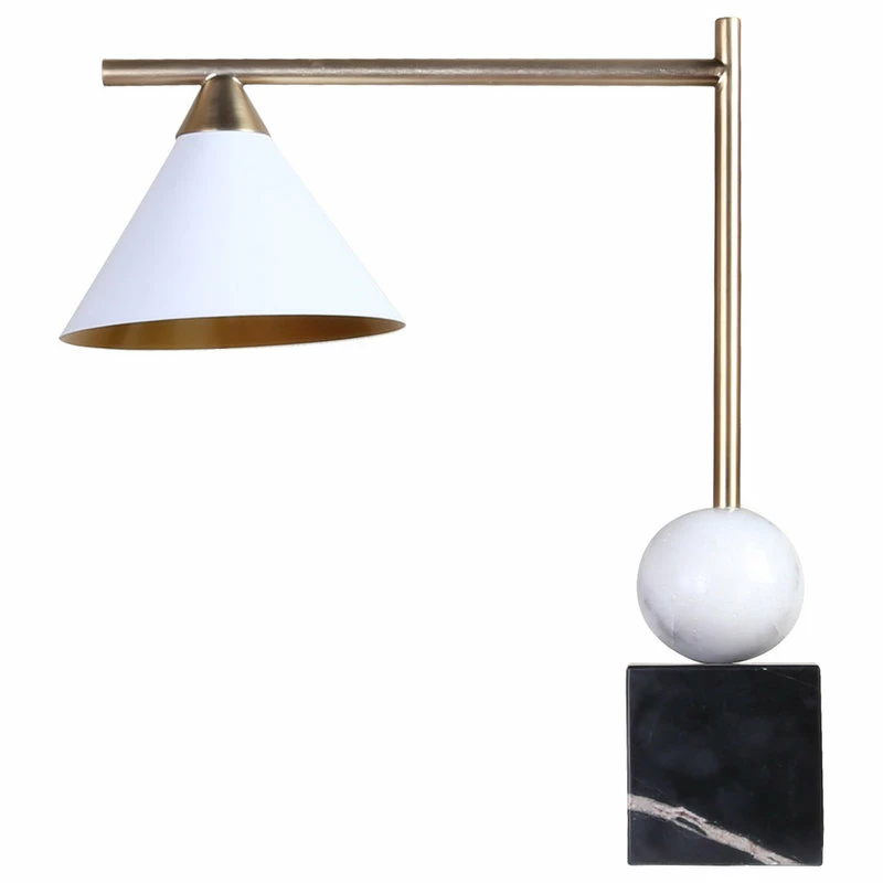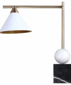 The exquisite table lamp is in a gold finish with a white metal shade. The base is made out of marble in black and white color. It is great for chair side reading or general room illumination.