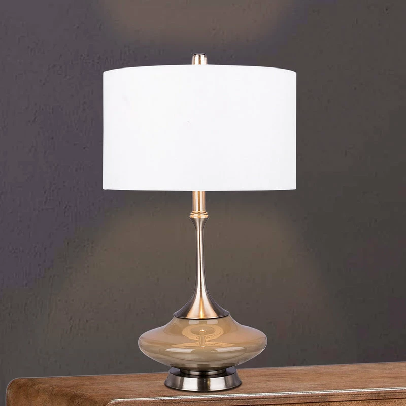Fangio Lighting’s #5137GRY 26.5 in. Table Lamp boasts a retro chic Grey Glass piece that is sure to become an instant favorite! This lamp is made with extreme attention to detail as seen here through the use of the Brushed Steel accents in clean line forms! The finishes found here are among the most desired hues in today’s homes. The striking form and unique feel will easily brighten your most treasured location. Illuminate your decorating possibilities! Showcase your exquisite tastes and bring this lamp home! You will be glad you did. Item comes complete with a decor friendly, designer White Linen Drum shade, along with an easy to use 3-Way Switch. Light is both UL Listed and CSA approved. Item is perfect for classic traditional style lovers along with those who enjoy making a modern statement.