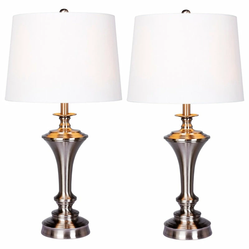 Two luxury lamps without paying a luxury price! Fangio Lighting’s #1565BS-2PK Pair Of 30 in. Metal Urn Table Lamps in Brushed Steel Finish are sure to instantly charm. Attention to detail can be found in the striking look and stunning, Pedestal Base design that will add a subtle Classic flare to your favorite space. The Brushed Steel finish is among the most desired in homes today! Lamp set includes two designer shades made in a dοΏ½cor friendly hue of White. Each Light comes complete with an easy to use 3-Way switch. This set takes 2 bulbs, each with a maximum wattage of 100 (Not Included.) Lamps are UL and CSA Listed. Showcase your discerning tastes brilliantly with this set. The stylized, Urn with Pedestal Base look possesses its own presence while illuminating your exquisite decorating tastes. If you enjoy the graceful lines of Traditional designs, this is the lamp collection for you! Bring these lights home! You will be glad you did!
