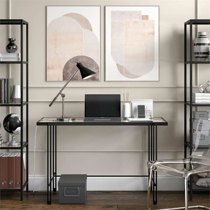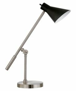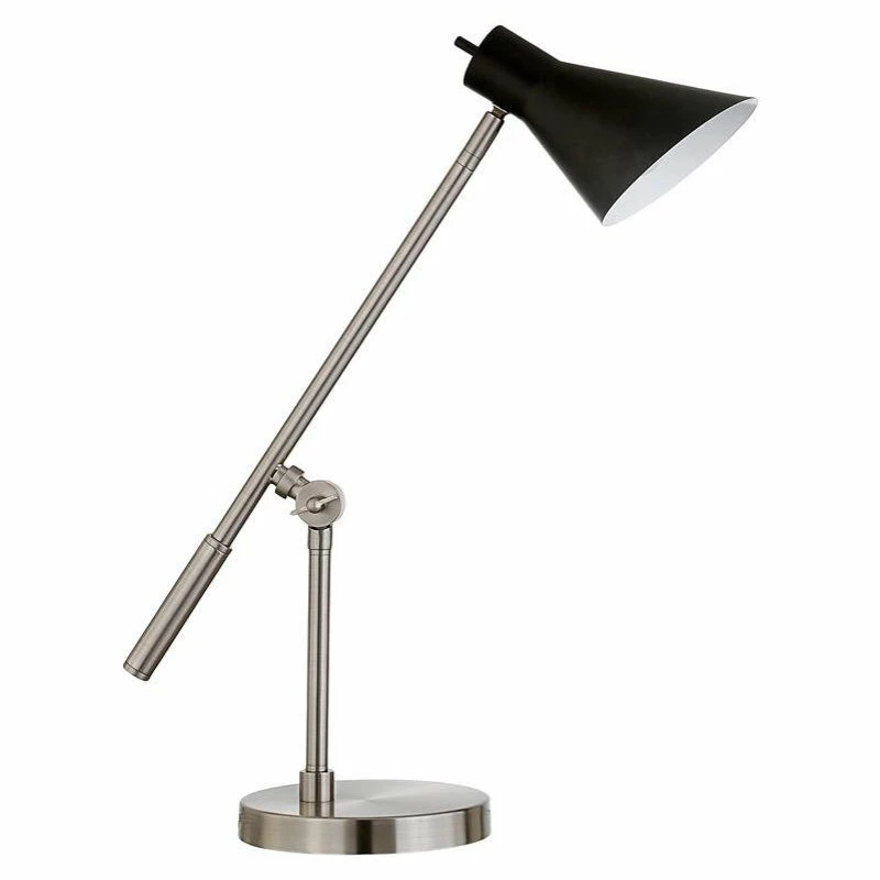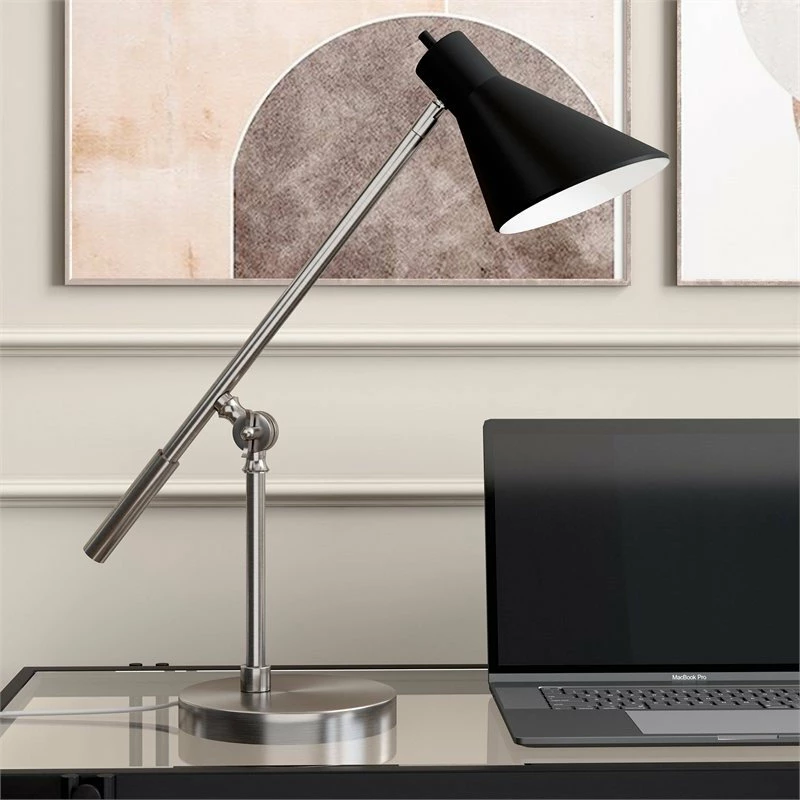 Elevate your reading nook or home office set-up with this sleek update on a mid-century design. The perfect task light, this two-toned table lamp counterbalances function and form in an appealing blend of curves and angles. Its adjustable boom-arm allows for perfectly targeted lighting, while the neutral metallic finish and asymmetrical metal shade provide a cozy glow to your bedside or desk.