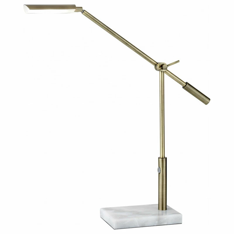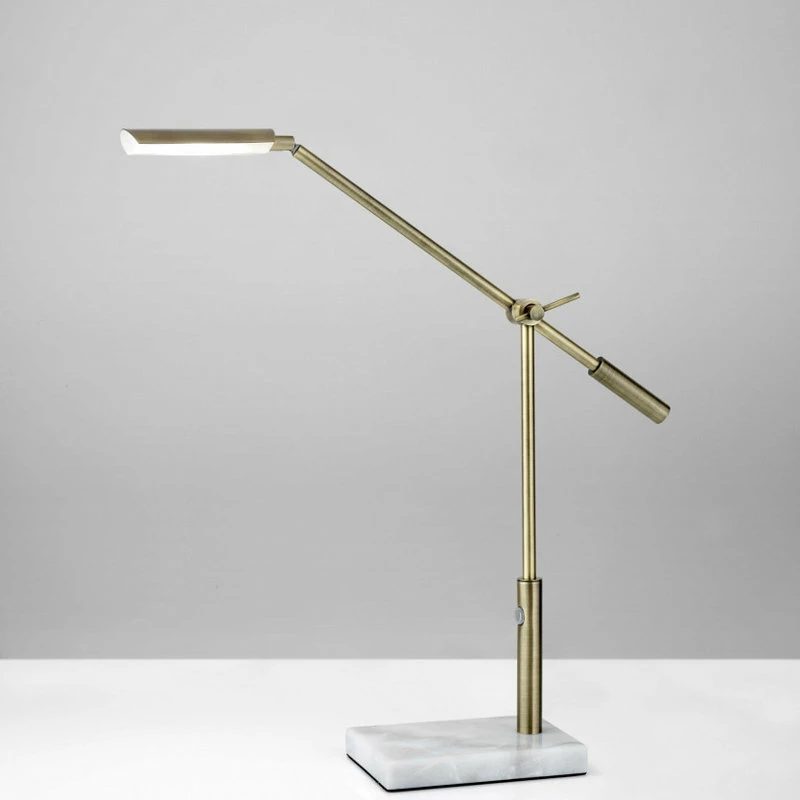 Comprised of antique brass and white marble, this LED Desk Lamp reveals a striking mix of industrial and elegant designs. 500 lumens of strong, energy efficient LED task lighting can be dimmed using a touch dimmer switch and also directed where it is needed with an adjustable shade and arm. This full spectrum LED light emulates natural daylight to ease the strain on your eyes. This lamp has a black cord and is not smart outlet compatible. The LED lights are integrated into the lamp and are not replaceable, but last 50,000 hours.