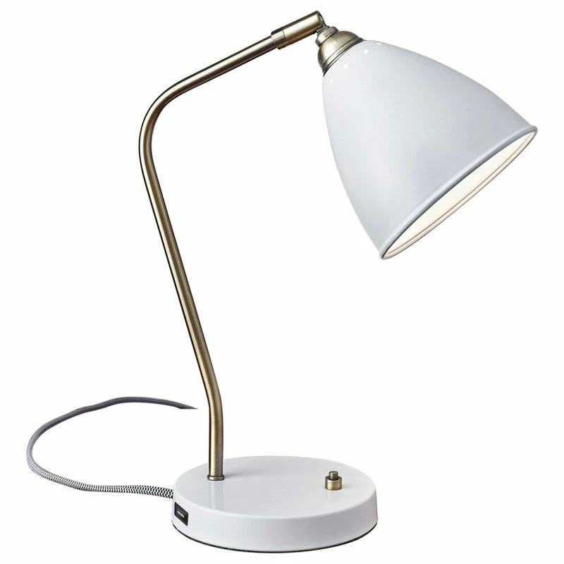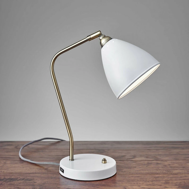A modern twist on a classic style. This desk lamp captures the best of mid-century and industrial task lamps in a clean shape for today. The adjustable white painted metal shade and base are complemented by a black & white fabric cord and antique brass angled arm. An on/off brass push button switch is located on the base. This lamp is smart outlet compatible. Bulb is not included.