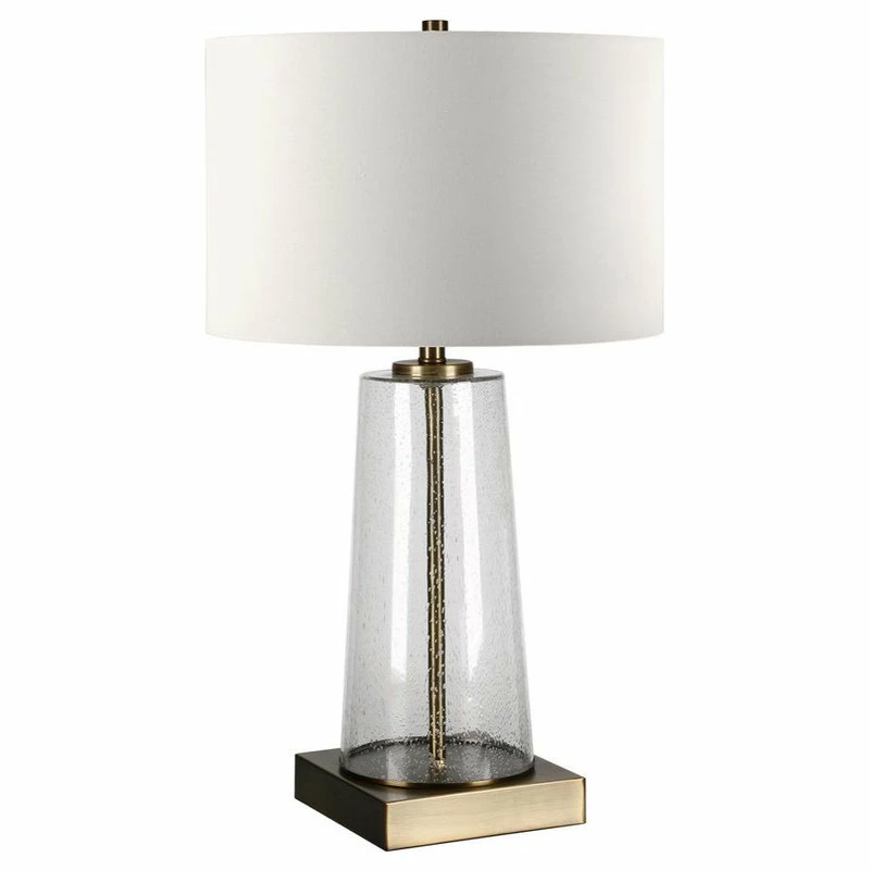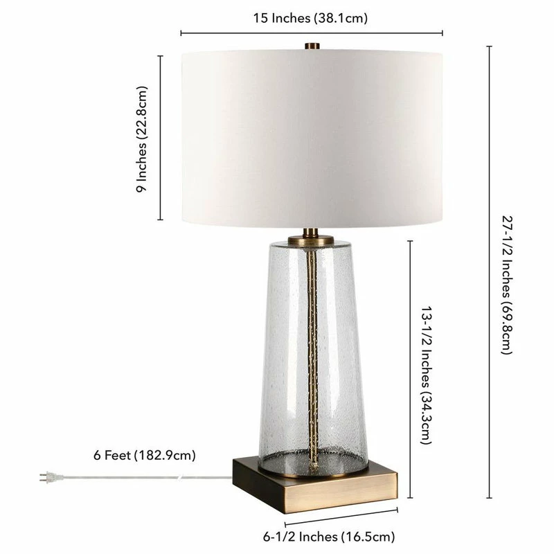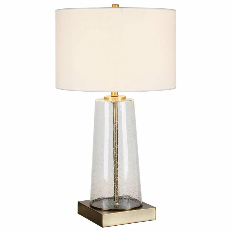 This table lamp combines natural elements of the seeded glass body and linen shade for an elegant organic feel.