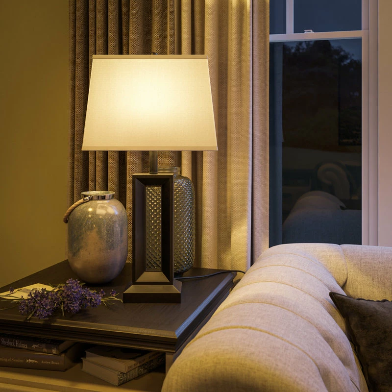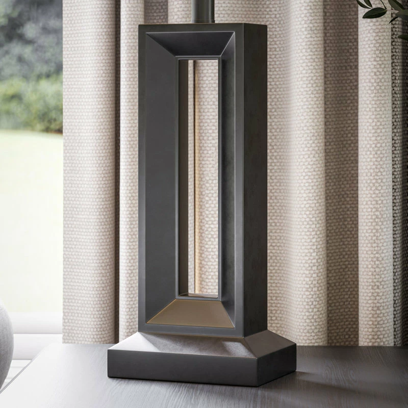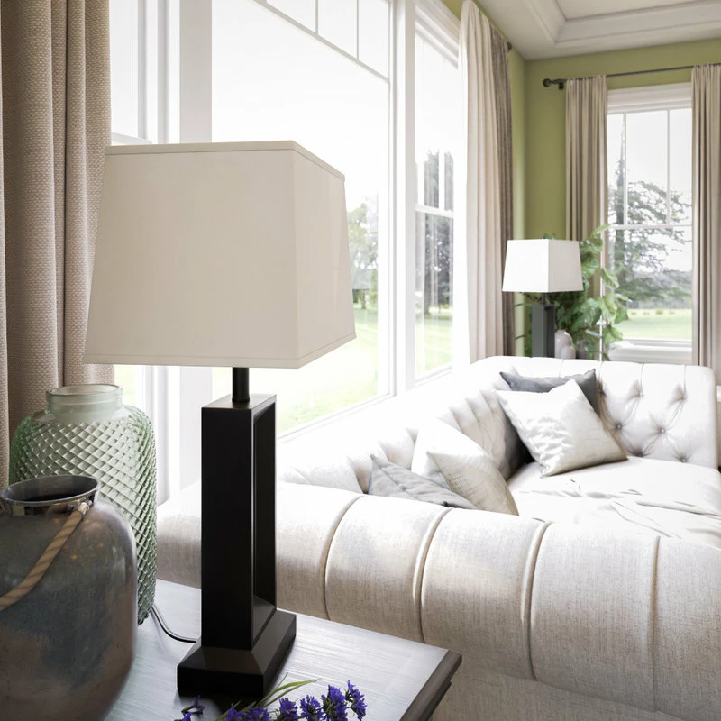 Contrasting black rectangular cutout frame detail with the rectangular shades give these lamps an ultra-chic modern bohemian look. Traditional elements meet modern colors for multi-use set of two matching table lamps. Bring the best of transitional style to your living room with a casual twist. Topping it all the white rectangular shades diffuse the light to create bright, room-filling illumination from beside your Bohemian peg leg accent chair. With two lamps, you can easily place both on top of end tables to flank a tufted sofa, or place in different rooms to create a cohesive casual style throughout your home.. 1-100 3-Way Bulb, 3-Way Socket Switch. Requires 1: 100 Watt Bulb (Bulbs Not Included). UL Listed