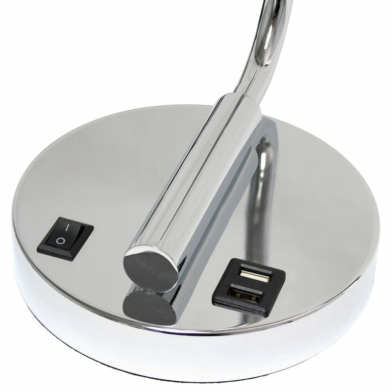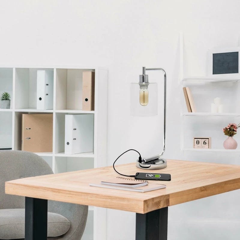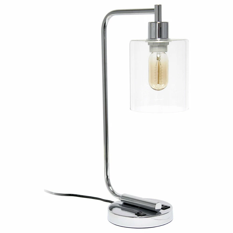 Simple yet modern, this desk lamp is sure to add a touch of style to any room in your home. This beautifully crafted iron desk lamp combines a simple base with a curved arm, (2) USB ports, and a clear cylinder glass shade for a sleek and sophisticated combination. Perfect for your desk, foyer or bedside table for a modest, refined look in trendy lighting. **HELPFUL TIP: To get the complete industrial look, we recommend using a decorative Edison/Vintage bulb (not included). **