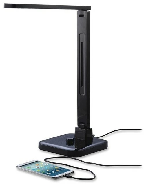 Smart LED Desk Lamp features Bluetooth technology and built-in speaker for integration of media, audio and cell phones. It also includes play, pause and skip controls for playing music. LED light features brightness control and four temperature controls (read, study, relax and sleep). Read mode at 5300K brightness stimulates concentration and reduces eyestrain with the choice of mid-range color temperature. Study mode at 6200K increases attention and concentration with the choice of high-range color temperature. Relax mode at 4200K promotes relaxation along with improved mood and the choice of low-range color temperature. Sleep mode at 3300K encourages a deep sleep with the comfort of a soft light. Lamp also features an anti-glare design for eye protection. Articulating lamp head makes it extremely versatile with 180-degree rotation. Lamp includes a 2.0 USB power outlet on the base for charging additional devices.