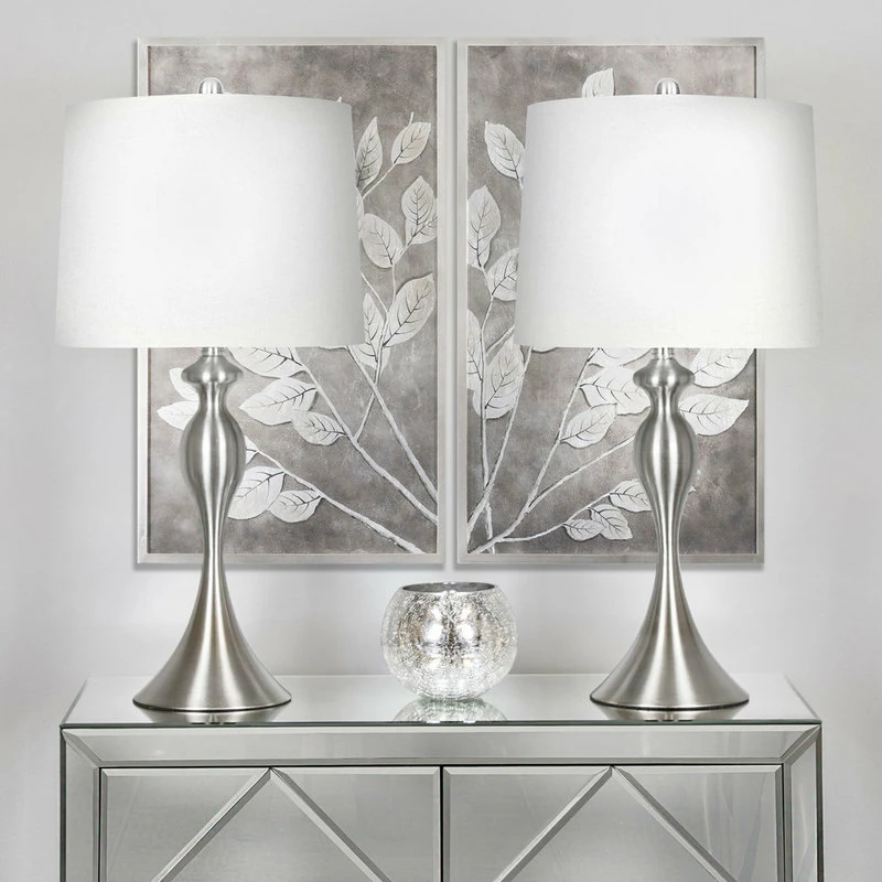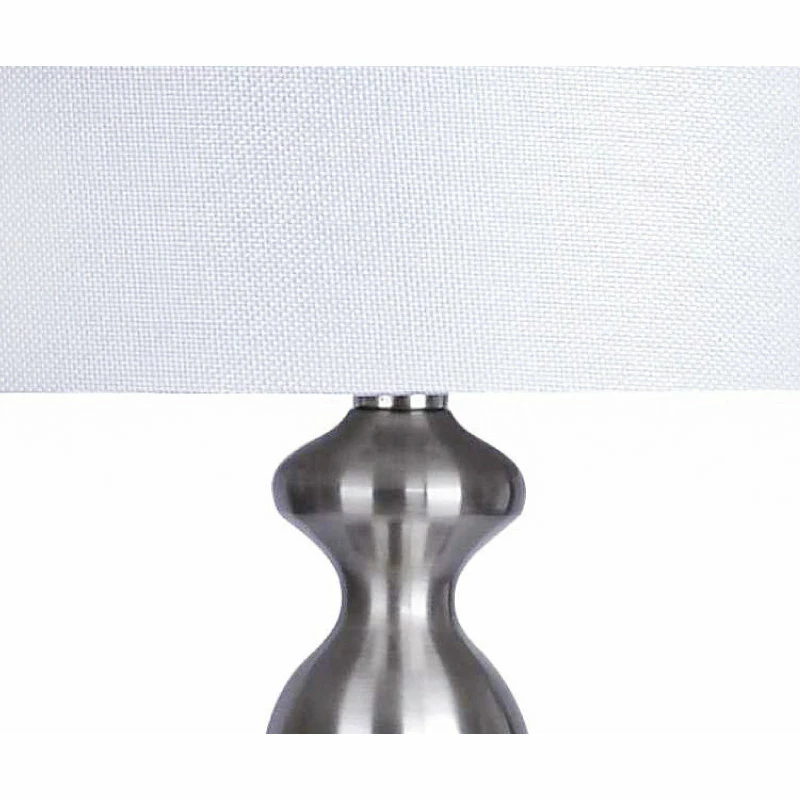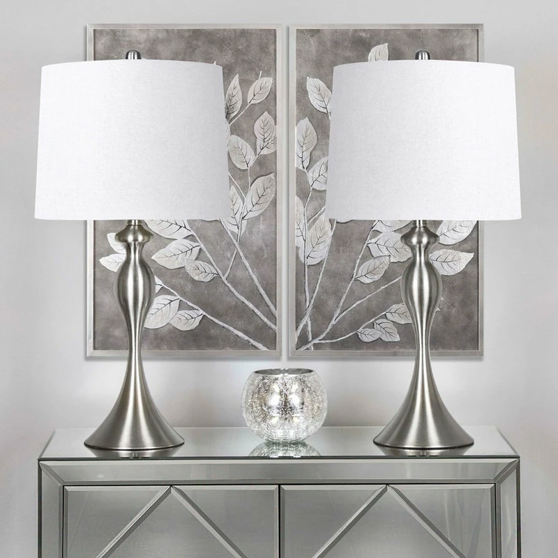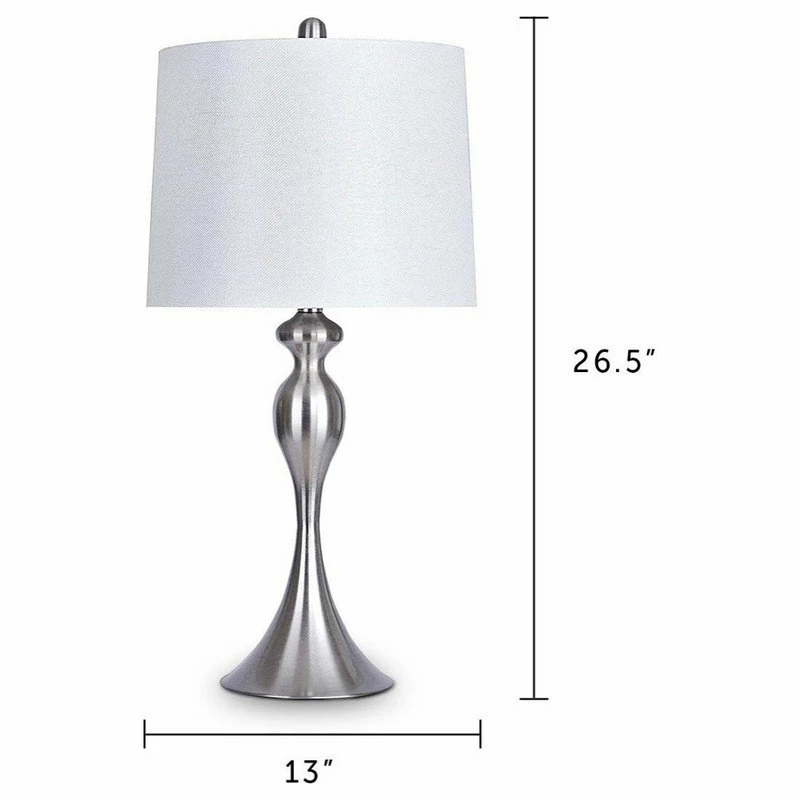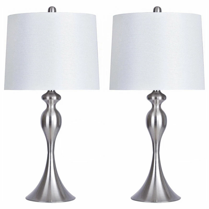SET OF TWO This set of two table lamps with a white lamp shade is the perfect addition to any space to provide additional light or just as a beautiful dcor element LINEN SHADE AND BRUSHED NICKEL These 26.5 total height table lamps feature a white lampshade with a curvaceous lamp body, finished in brushed nickel. They add the perfect finishing touch to any space. CLASSIC AND CONTEMPORARY The classic and contemporary design elements ensure these lamps perfectly complement any style or type of dcor FOR BEDSIDE AND MORE This pair of lamps is perfect for setting on bedside tables, dressers, front entry tables or any space that youre looking to add some wow to! HIGH-QUALITY AND DURABLE These table lamps are the highest quality, durable and sure to last the test of time. Youll be enjoying additional light and a beautiful dcor touch for years to come