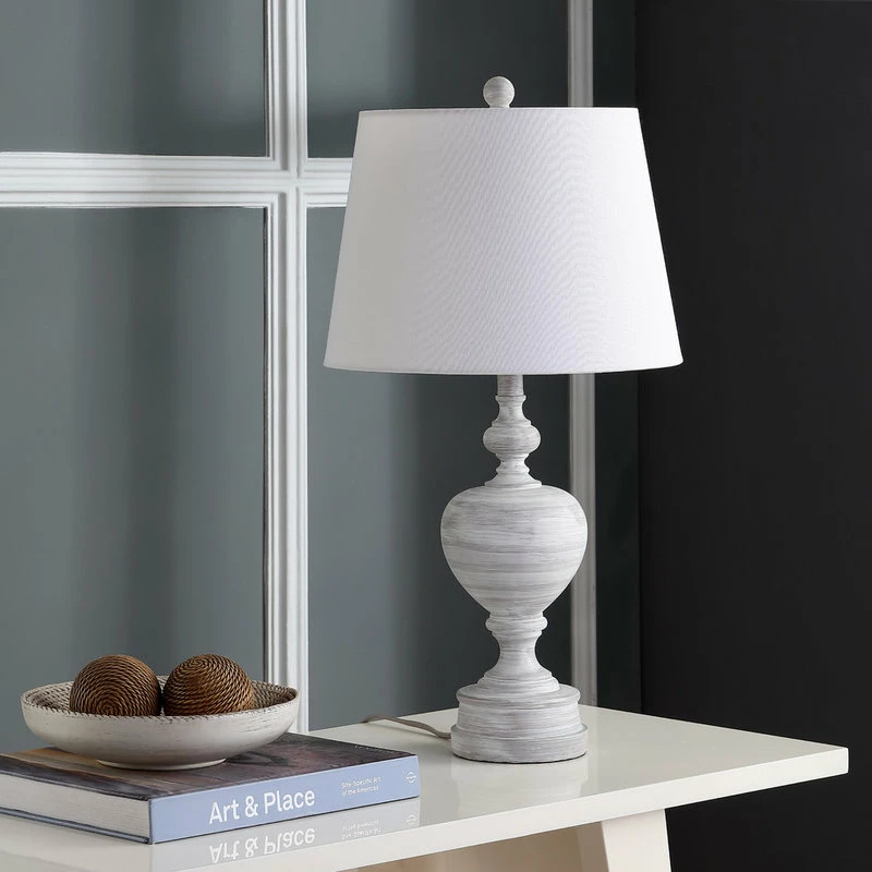 This contemporary table lamp is perfect for the modern tastemaker. It’s monochrome white wash finish and sleek off-white shade adds a touch of elegance to any living room, bedroom, or home office. This lamp comes in a set of 2.