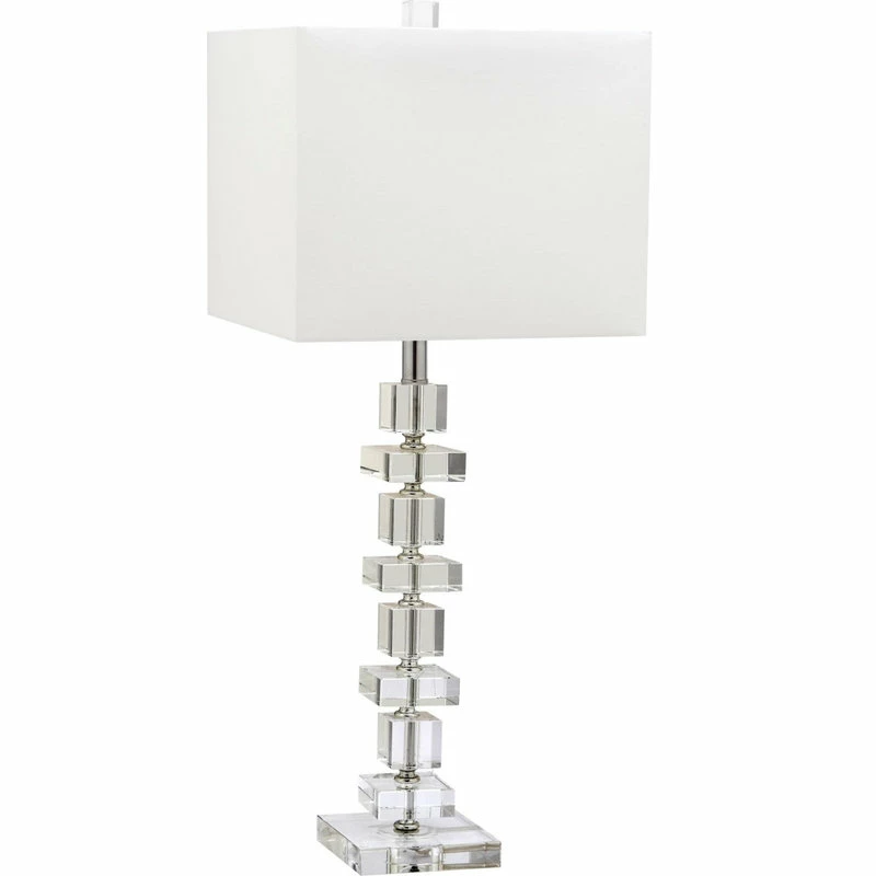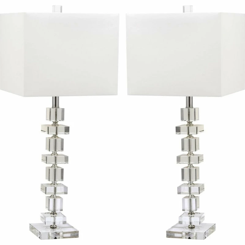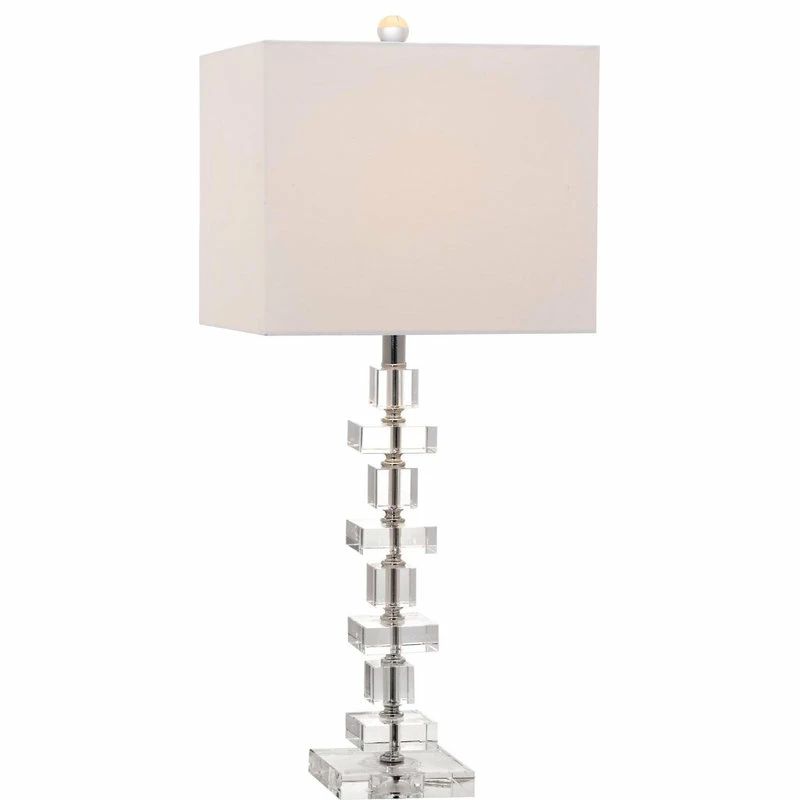 Alternating large and small blocks of solid crystal create a dramatic statement in this set of two Deco Crystal table lamps. With chrome fittings and contemporary rectangular cotton shade, graphic geometric forms recall the glamour of Art Deco style.