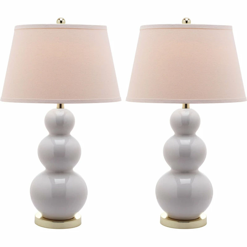 Balance fashion, form and function with the Pamela Triple Gourd table lamp, its three beautifully turned white ceramic gourds graduating in size. With brushed gold stand and fittings, crisp white cotton tapered shade, and a 3-way switch that allows you to adjust the light in your room, Pamela adapts beautifully to any setting.