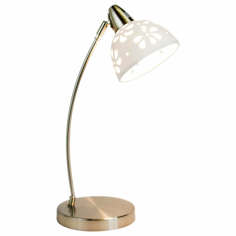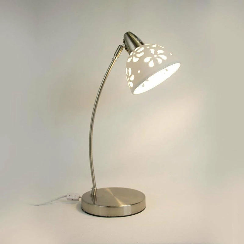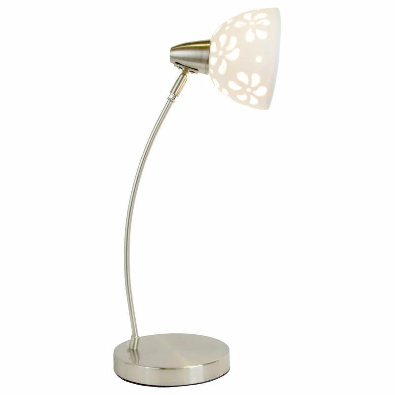This delicate brushed nickel desk lamp is both functional and stylish. It features a white porcelain shade with beautiful floral cutout pattern that allows the light to shine through and add a feminine touch to any room or office.