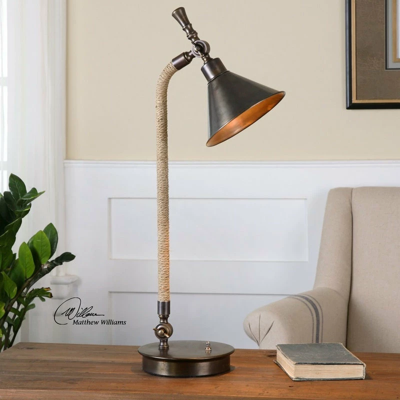 Color/Finish: Metal Base Finished In A Plated Oxidized Bronze Accented With A Wrapped Tea Stained Rope Around The Neck. Base Arm And Shade Pivots Up And Down.