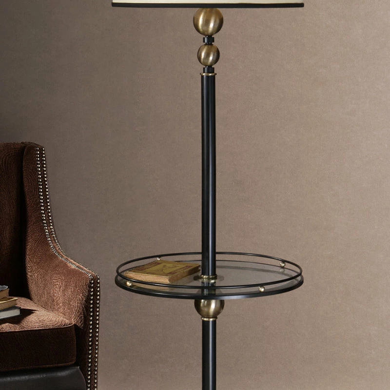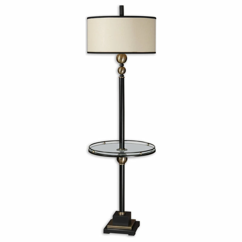 Add traditional style to your space with the Uttermost Revolution End Table Floor Lamp. This piece features a rustic black finish with coffee bronze accents and a tempered glass tray. The drum shade is made of off-white linen fabric with black trim. Features: